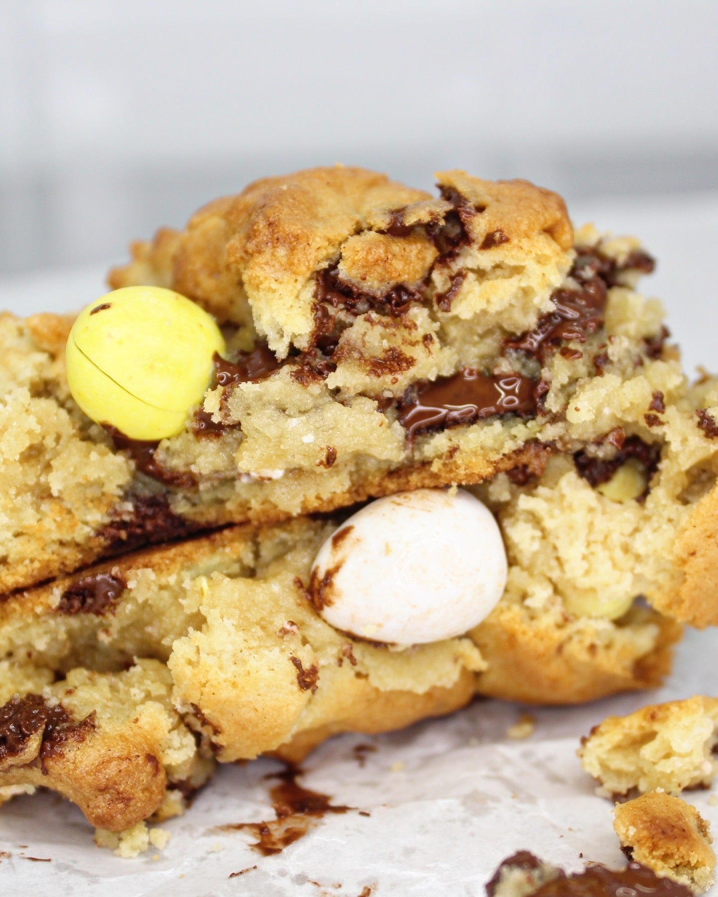Our Crunchy Chocolate Gems cookie is loaded with rich chocolate chips and colorful candy-coated chocolate bites baked right into the dough, creating the perfect balance of crunch and melt-in-your-mouth goodness. Every bite delivers layers of texture—crispy edges, a soft, gooey center, and bursts of chocolate in every corner.